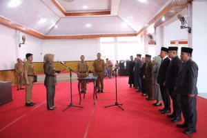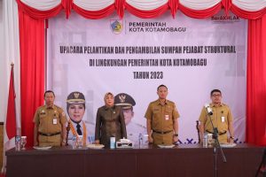 Upacara Pelantikan dan Pengambilan Sumpah Pejabat Struktural dilingkungan Pemerintah Kota Kotamobagu yang dilaksanakan di Aula Rumah Dinas Wali Kota tersebut dihadiri Sekretaris Daerah Kota Kotamobagu, Sofyan Mokoginta, S.H., M.E, para Asisten, para pimpinan Organisasi Perangkat Daerah (OPD), serta ASN dilingkungan Pemerintah Kota Kotamobagu.