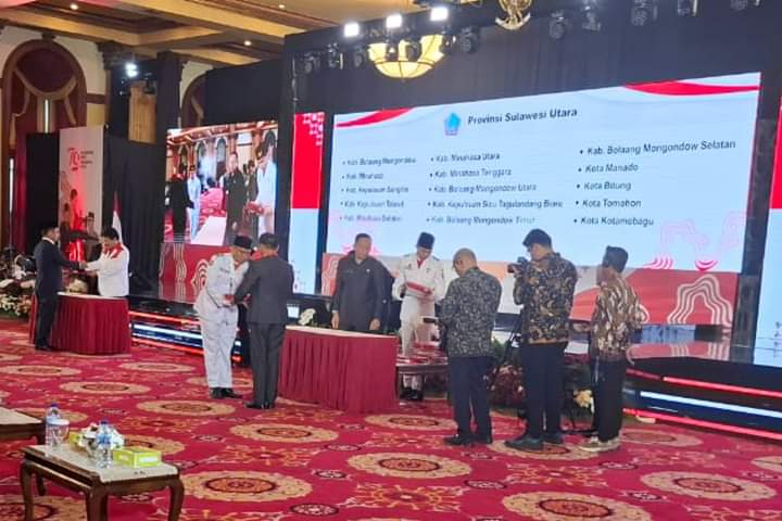 BOLMONG,SULUTPOST – Penjabat Bupati Bolaang Mongondow dr. Jusnan C. Mokoginta, MARS, di dampingi Sekretaris Daerah (Sekda) Hi.Abdullah Mokoginta, SH, M.S.i, dan Kepala Badan Kesbang dan Politik Drs. Cris T Kamasaan, menghadiri Prosesi penyerahan Duplikat Bendera Pusaka Kepada Gubernur dan Bupati/Walikota seluruh Indonesia.