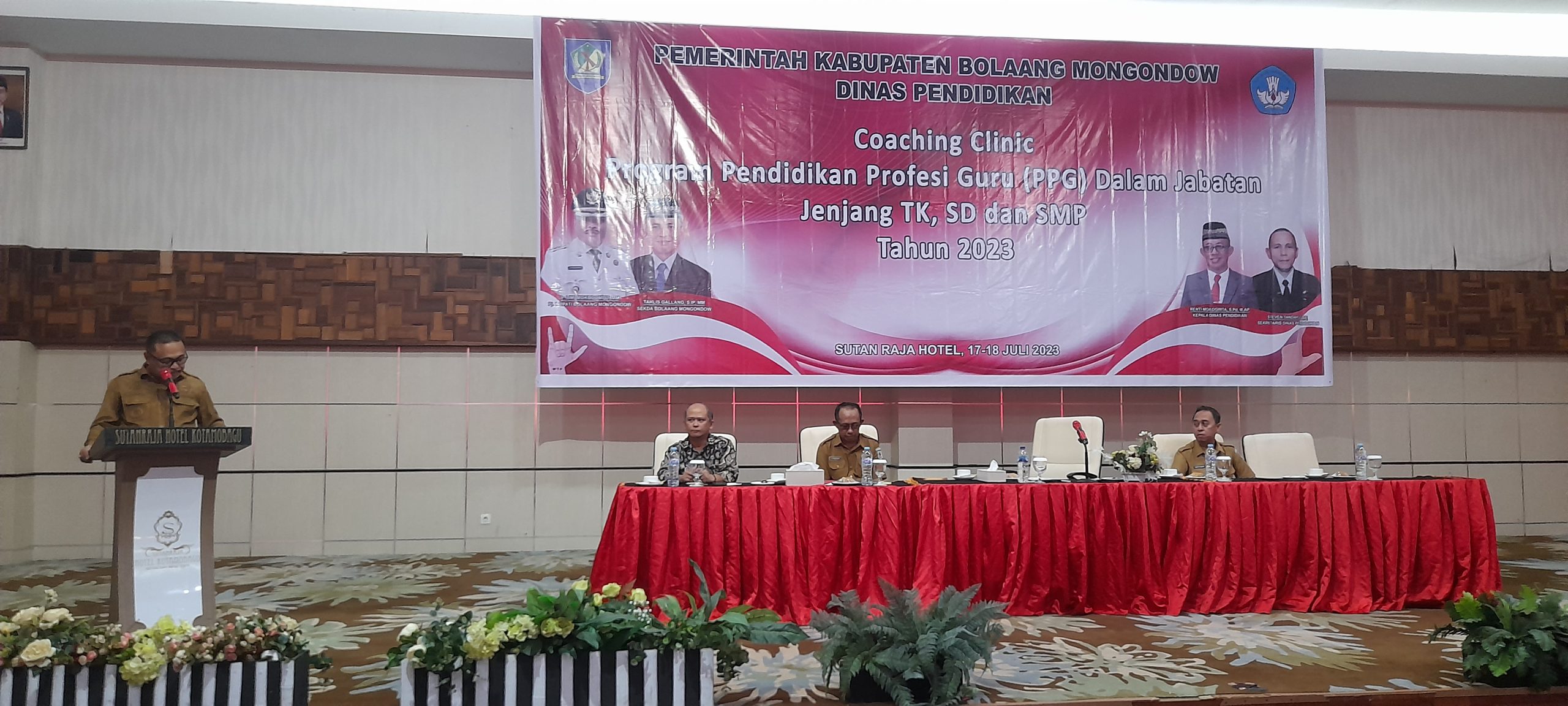 BOLMONG,SULUTPOST-Dinas Pendidikan Kabupaten Bolaang Mongondow ( Diknas Bolmong ), Senin 17 Juli 2023, menggelar kegiatan Coaching Clinic, berupa Program pendidikan profesi guru se,Kabupaten Bolaang Mongondow, tepatnya di Ballroom Hotel Sutan Raja Kotamobagu.