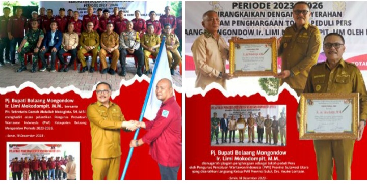 BOLMONG,SULUTPOST-Ketua Persatuan Wartawan Indonesia (PWI) Provinsi Sulawesi Utara (Sulut) Drs.Voucke Lontaan, resmi melantik kepengurusan Organisasi Persatuan Wartawan Indonesia (PWI) Kabupaten Bolaang Mongondow, Masa bakti periode 2023-2026, yang rangkaikan dengan penyerahan Piagam Penghargaan Tokoh Peduli Pers kepada Bupati Bolmong Ir.Limi Mokodompit MM.