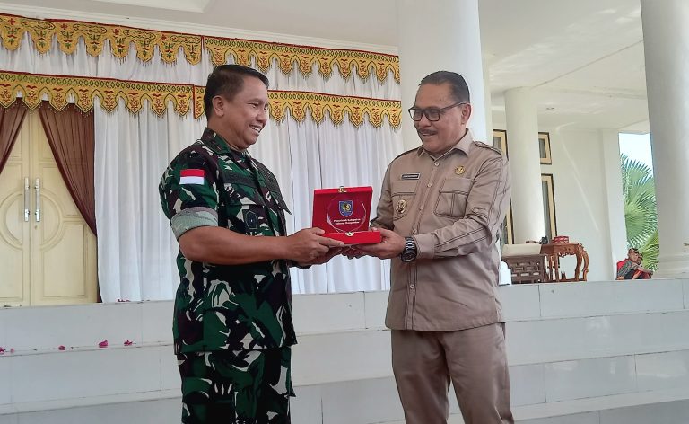 Usai memberikan sambutan Bupati Limi Mokodompit kemudian memberikan cendramata kepada Pangdam XII Merdeka Mayjen TNI Legowo W.R Jatmiko.