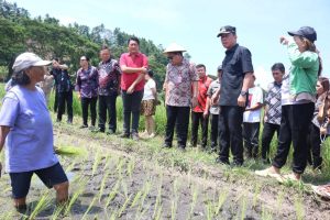 MINSEL SULUT POST – Bupati Minahasa Selatan Franky Donny Wongkar, SH. melakukan peninjauan pelaksanaan penanaman padi dwah bertempat di areal persawahan Desa Papontolen Kecamatan Tumpaan.