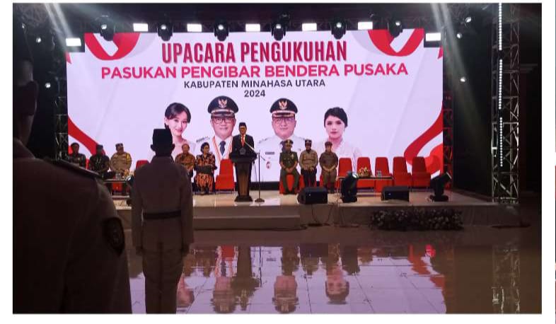 Pengukuhan ke- 31 pasukan pengibar bendera oleh Bupati Minahasa Utara Joune Ganda, disaksikan oleh Wakil Bupati Kevin W Lotulung, Sekda Minut Novly Wowiling, unsur Forkopimda, tamu kehormatan E E Mangindaan bersama istri, serta para orang tua.