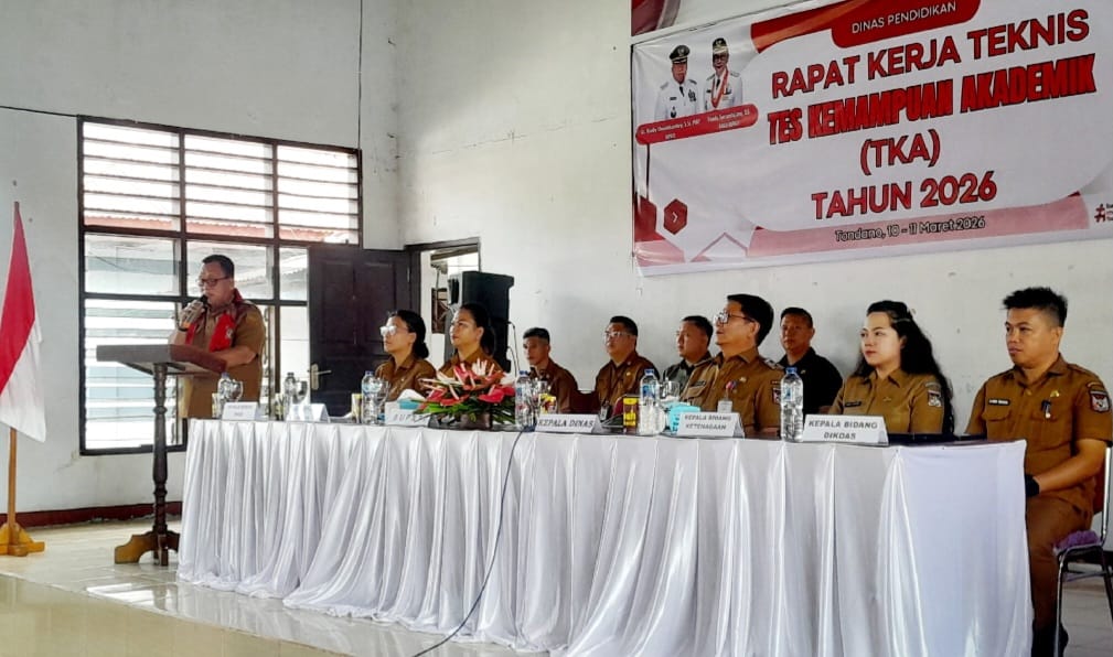 Pesan tersebut disampaikan Bupati saat membuka Rapat Kerja Teknis Tes Kemampuan Akademik (TKA) Jenjang SD dan SMP Tahun 2026 di Aula Dinas Pendidikan Kabupaten Minahasa, Selasa (10/3/2026).