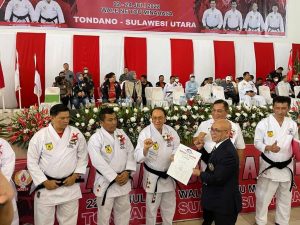 Usai pembukaan, kegiatan dilanjutkan dengan penganugerahan Dan II Kehormatan Pengurus Besar Karate-Do Gojukai Indonesia kepada Kajati Sulut, Wakajati Sulut, Bupati Minahasa, Kajari Minahasa Diky Oktavia SH MH beserta pejabat Kajati lainnya dalam pemberian Sertifikat oleh Wakil Ketua Dewan Guru Nasional PB Karate-Do Gojukai Indonesia Renshi Sihan Mahdi Shahab. (Wil Wongkar)