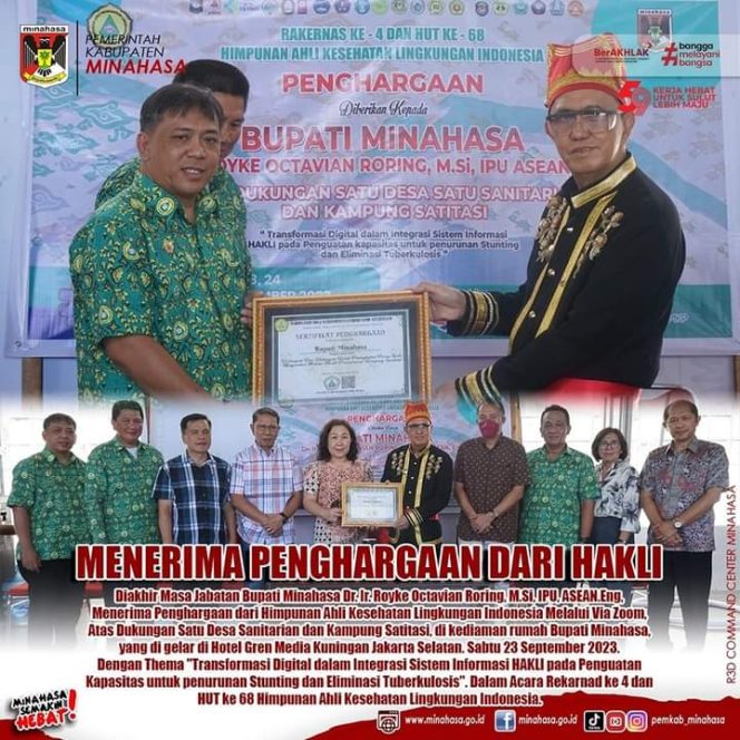 MINAHASA, SULUYPOSTONLINE.ID – Diakhir Masa Jabatan Bupati Minahasa Dr. Ir. Royke Octavian Roring, M.Si, IPU, ASEAN.Eng, kembali Menerima Penghargaan dari Himpunan Ahli Kesehatan Lingkungan Indonesia Melalui Via Zoom, Atas Dukungan Satu Desa Sanitarian dan Kampung Sanitasi, bertempat di kediaman rumah Bupati Minahasa, Sabtu (23/9/23).