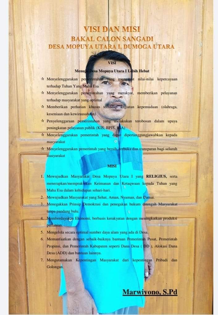 BOLAANG MONGONDOW, SULUT POST – Pemilihan Sangadi (Pilsang) Bolaang Mongondow tahun 2022 ini, ada sosok mantan guru kepala sekolah yang patut diandalkan, karena usai mengabdi di dunia pendidikan, kini dirinya siap mengabdikan diri sebagai Kepala Desa (Kades/Sangadi), Marwiyono S.Pd namanya, ia siap ikut Pilsang, untuk memajukan Desa Mopuya Utara Satu (1) bersama masyarakat.