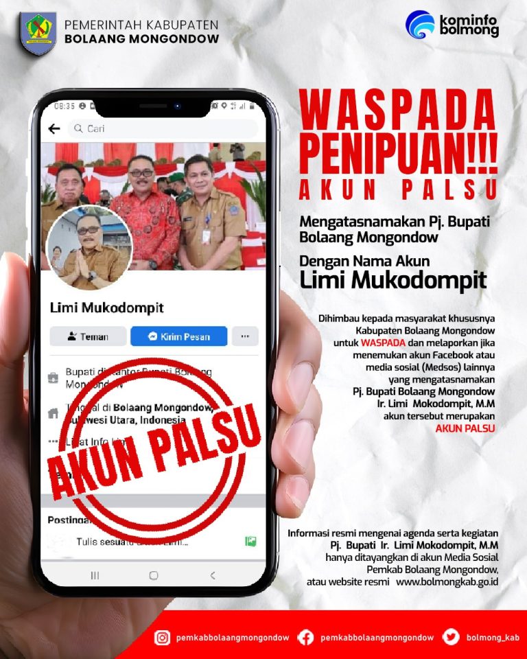 Dalam himbauan yang dikeluarkan oleh Dinas Kominfo, Menyampaikan masyarakat di wilayah Kabupaten Bolaang Mongondow diharapkan untuk meningkatkan kewaspadaan terhadap akun-akun sosial media yang mengklaim sebagai Bupati Bolaang Mongondow, Ir. Limi Mokodompit, M.M, karena akun-akun tersebut merupakan akun palsu.