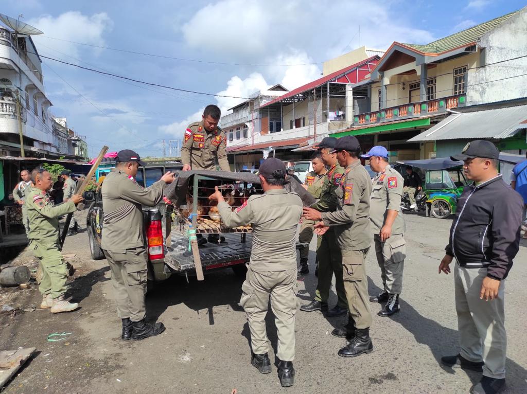 KOTAMOBAGU,SULUTPOST-Dinas Polisi Pamong Praja dan Damkar Kota Kotamobagu bersama Dinas Perdagangan Koperasi dan UKM dan Dinas Perhubungan melakukan penertiban pedagang yang menggunakan bahu jalan dan trotoar di area Eks Pasar Serasi dan Pasar 23 Maret Kotamobagu.