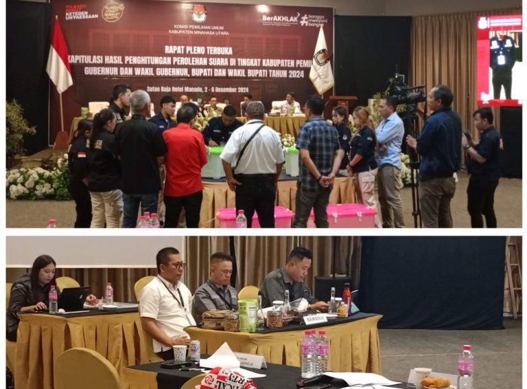 MINUT, SULUTPOSTonline.id – Rapat pleno terbuka untuk merekapitulasi hasil penghitungan suara di tingkat kabupaten dalam pemilihan gubernur dan wakil gubernur, bupati dan wakil bupati tahun 2024 telah dimulai sejak Senin, 2 Desember di Sutanraja Hotel Watutumou Kalawat Minut, Senin (2/12/2024).