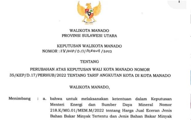 Keputusan baru Walikota Manado tersebut adalah No. 235/KEP/D.17/PERHUB/2022 tentang Perubahan Atas Keputusan Walikota Manado No. 35/KEP/D 17/PERHUB/2022 tentang Tarif Angkutan Kota di Kota Manado.