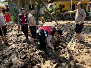 “Atas perintah Kapolres seluruh personel diturunkan ke lokasi bencana, dalam melaksanakan bakti sosial, dengan membersihkan kubangan lumpur dan batu, serta potongan kayu yang menutupi badan jalan maupun pekarangan rumah warga,”tandasnya.