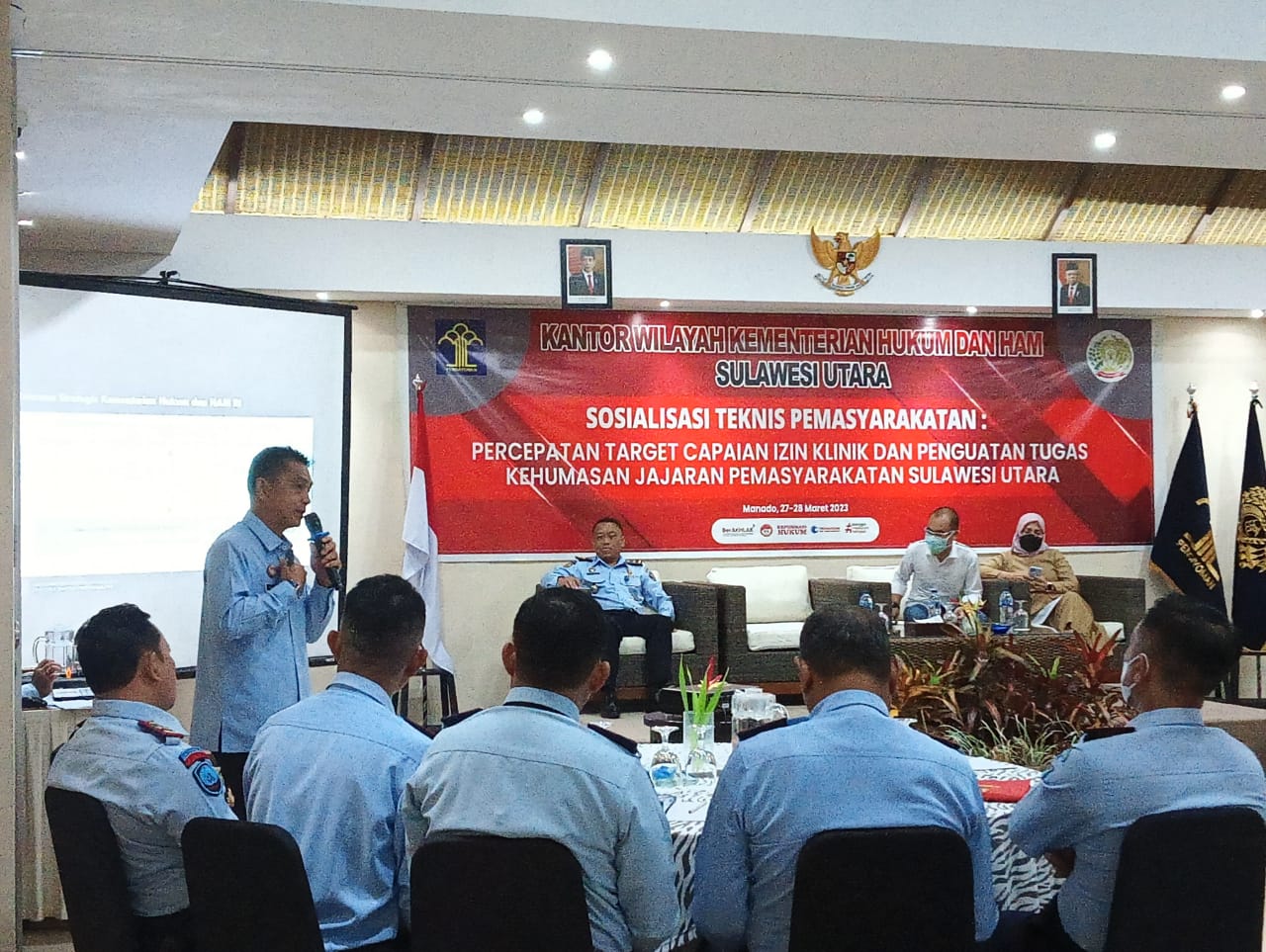MINAHASA, SULUTPOST – Kepala Lembaga Pemasyarakatan Kelas IIB Tondano Yulius Paath mengikuti kegiatan Sosialisasi Teknis Pemasyarakatan dengan tema, Percepatan Capaian Target Izin Klinik dan Penguatan Tugas Kehumasan pada Unit Pelaksana Teknis Pemasyarakatan Jajaran Kanwil Sulawesi Utara.