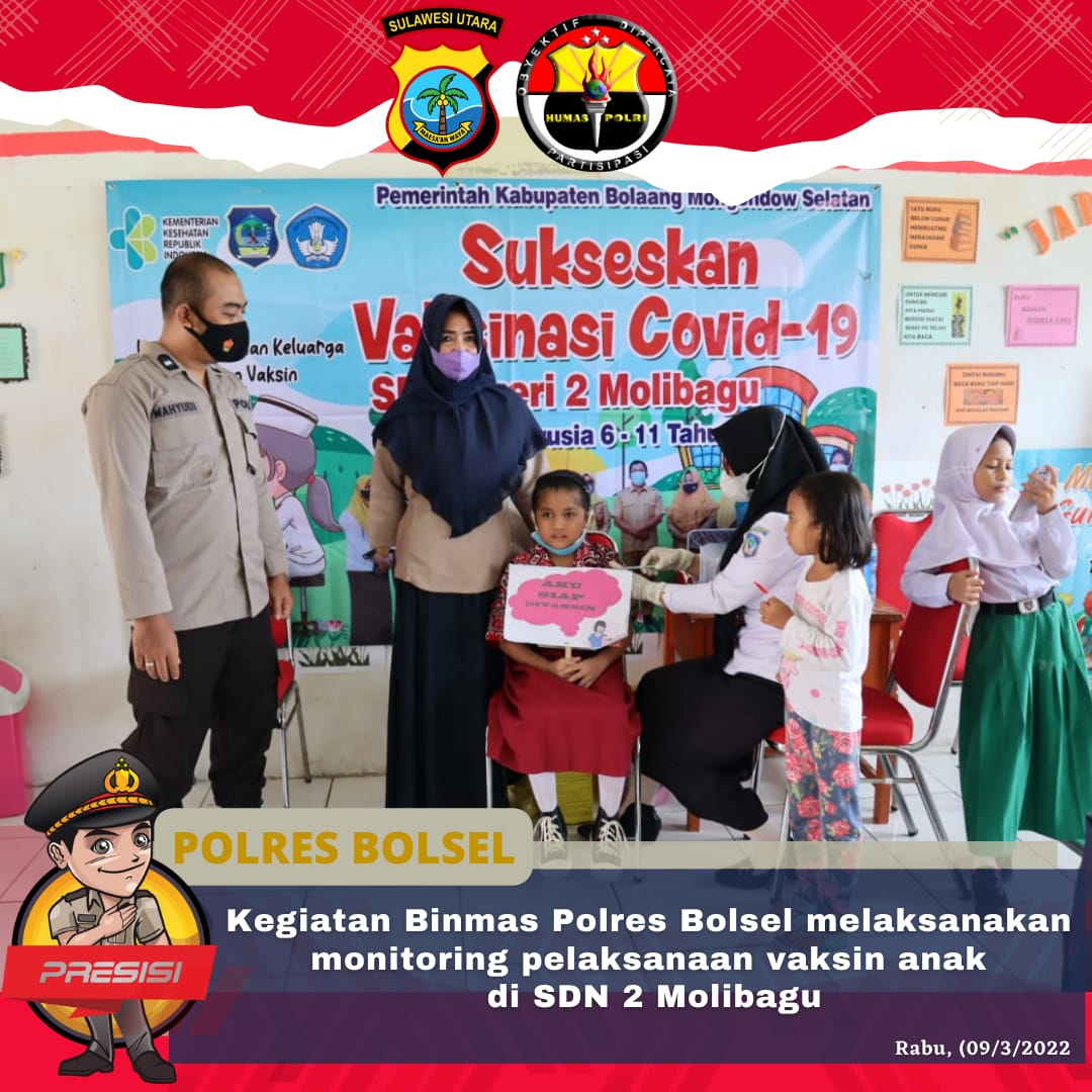BOLSEL, SULUTPOSTONLINE.ID – Satuan Binmas Polres Bolsel me peninjauan kegiatan vaksinasi anak usia 06 hingga 11 tahun di SDN 02 Molibagu.