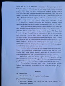 Lanjutnya menjelaskan dan mengurai terkait putusan hukum yang sebenarnya. bahwa berdasarkan putusan Mahkamah Agung RI. No. 1875.K/Pdt/1984. menyatakan, “penggabungan tuntutan perbuatan melawan hukum dengan tuntutan Wanpresstasi di dalam satu surat gugatan, tidak dapat dibenarkan menurut tertib beracara perdata. masing-masing tuntutan harus diselesaikan dalam gugatan tersendiri” serta disebutkan dalam Yurisprudensi Mahkamah Agung RI No. 2643K/Pdt/1994. tanggal 28 Mei 1999. ” Mencampuradukkan gugatan perbuatan melawan hukum dengan gugatan Wanpresstasi tidak dapat dibenarkan”. sehingga dengan mencapuradukkan gugatan dan perbuatan melawan hukum dalam satu gugatan, menjadikan gugatan tidak jelas atau kabur (Obscuur libel).