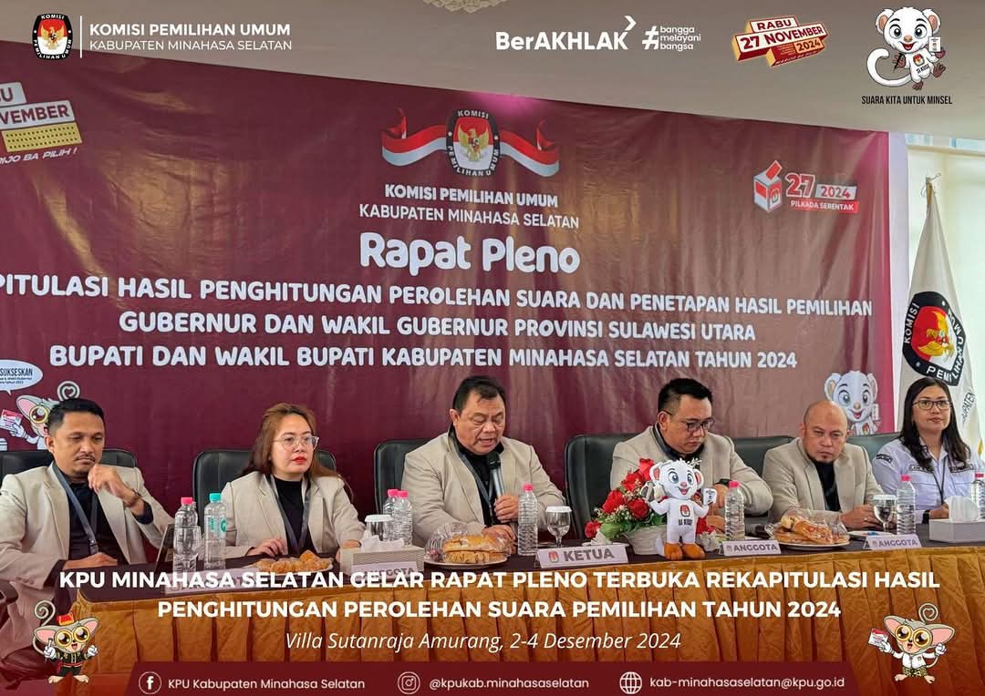Rekapitulasi Hasil Penghitungan Perolehan Suara Pemilihan Bupati dan Wakil Bupati Kabupaten Minahasa Selatan Tahun 2024 Ditetapkan KPU, Rabu 4/12/2024.