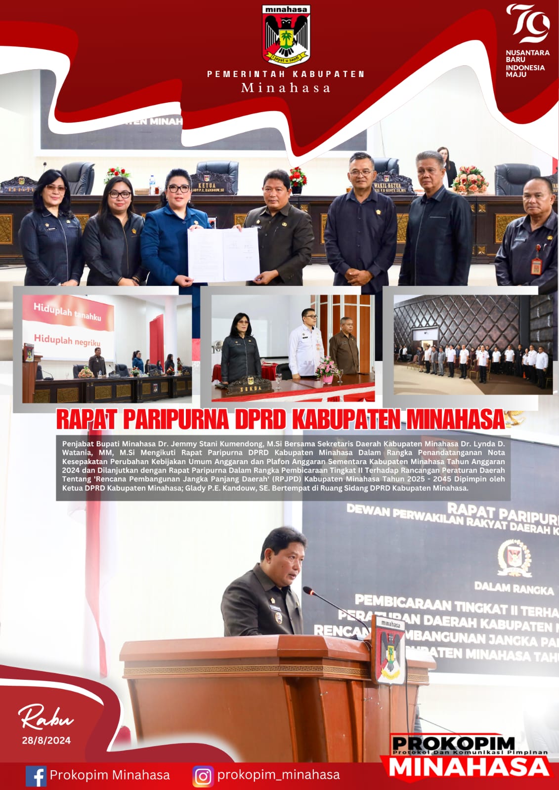 Usai itu, Penjabat Bupati Minahasa Dr Jemmy Stani Kumendong, MSi menyampaikan sambutannya terkait rapat paripurna penandatanganan nota kesepakatan perubahan KUA-PPAS tahun 2024 ini, dan dirangkaikan dengan pembicaraan tingkat II Rancangan Peraturan Daerah (Ranperda) tentang Rencana Pembangunan Jangka Panjang Daerah (RPJPD) Kabupaten Minahasa tahun 2025-2045.