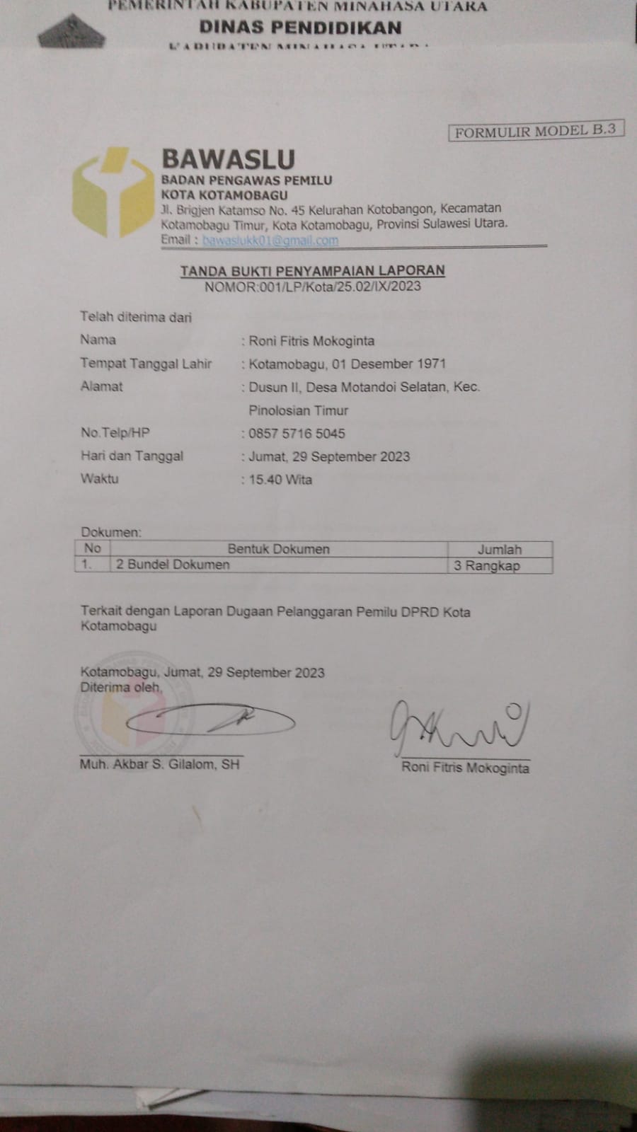 Hal tersebut tertuang dalam Laporan LSM FP2BM yang dilayangkan pada tanggal 22 September 2023 dan telah diterima oleh Bawaslu Kotamobagu pada Jumat 29 September 2023, atas Dugaan Tindak Pidana Pemalsuan Elemen Data Kependudukan / Pemalsuan Dokumen/Ijazah Untuk Pemenuhan Syarat Bakal Calon Anggota Legislatif (Bacaleg) Kota Kotamobagu, masa periode 2024 – 2029.