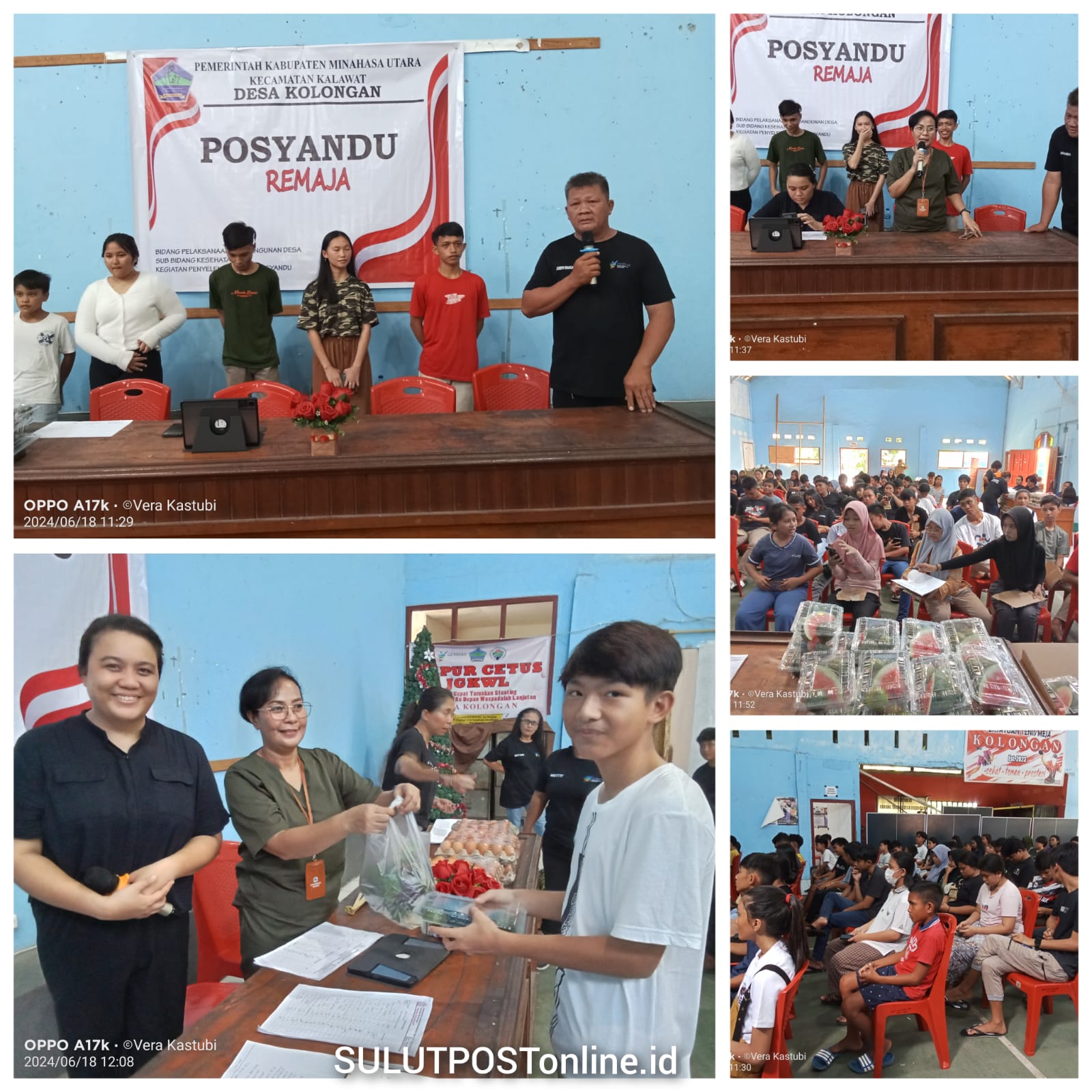 MINUT, SULUTPOSTonline.id. Pemerintah Desa Kolongan Kecamatan Kalawat selenggarakan “POSYANDU REMAJA”, serta membagikan makanan dan buah sehat kepada remaja desa Kolongan di Balai Desa Kolongan, Kecamatan Kalawat, Minahasa Utara, Sulut, Selasa (18/06/2024).