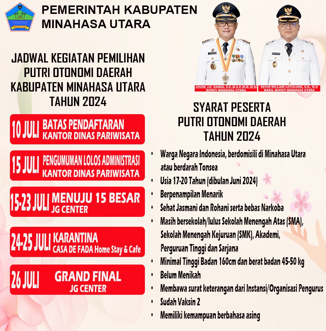 MINUT, SULUTPOSTonline.id – Dalam rangka menghadapi pemilihan putri otonomi Indonesia Pemerintah Kabupaten Minahasa Utara menggelar pemilihan Putri Otonomi Daerah (POD), dimana Kabupaten Minahasa Utara akan menjadi Tuan rumah pelaksanaan kegiatan Asosiasi Pemerintah Kabupaten Seluruh Indonesia (APKASI) dan Pemilihan Putri Otonomi Indonesia Tahun 2025.