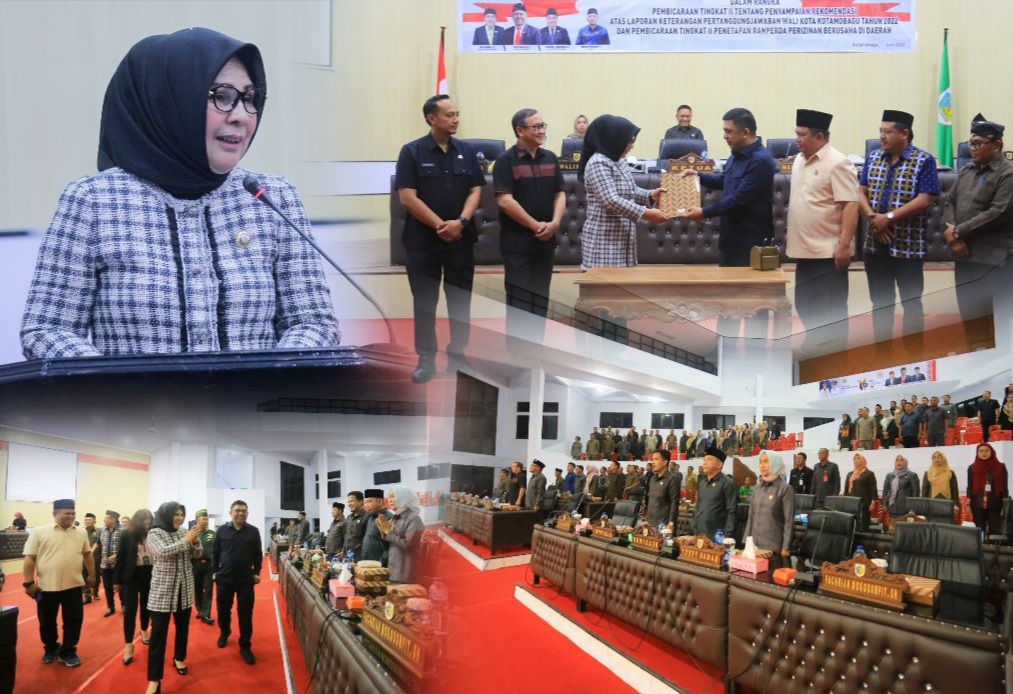KOTAMOBAGU,SULUTPOST-Ada yang menarik dalam pelaksanaan Rapat Paripurna DPRD Kota Kotamobagu Dalam Rangka Pembicaraan Tingkat II Penyampaian Rekomendasi atas Laporan Keterangan Pertanggungjawaban (LKPJ) Wali Kota Kotamobagu Tahun 2022 dan Pembicaraan Tingkat II Penetapan Rancangan Peraturan Daerah Tentang Perizinan Berusahan di Daerah, Senin (5/6/2023), di Gedung DPRD Kota Kotamobagu, Jalan Paloko Kinalang Kotamobagu.