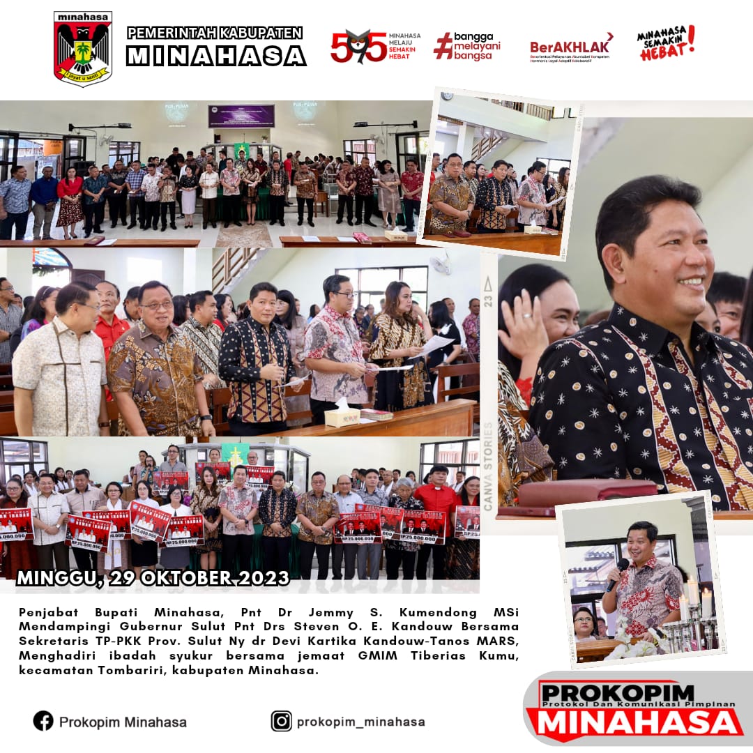 MINAHASA. SULUTPOST – Wakil Gubernur Sulut Pnt Drs Steven O. E. Kandouw didampingi istri tercinta Ny dr Devi Kartika Kandouw-Tanos MARS, bersama Penjabat Bupati Minahasa, Pnt Dr Jemmy S. Kumendong MSi menghadiri ibadah syukur bersama jemaat GMIM Tiberias Kumu, kecamatan Tombariri, kabupaten Minahasa.
