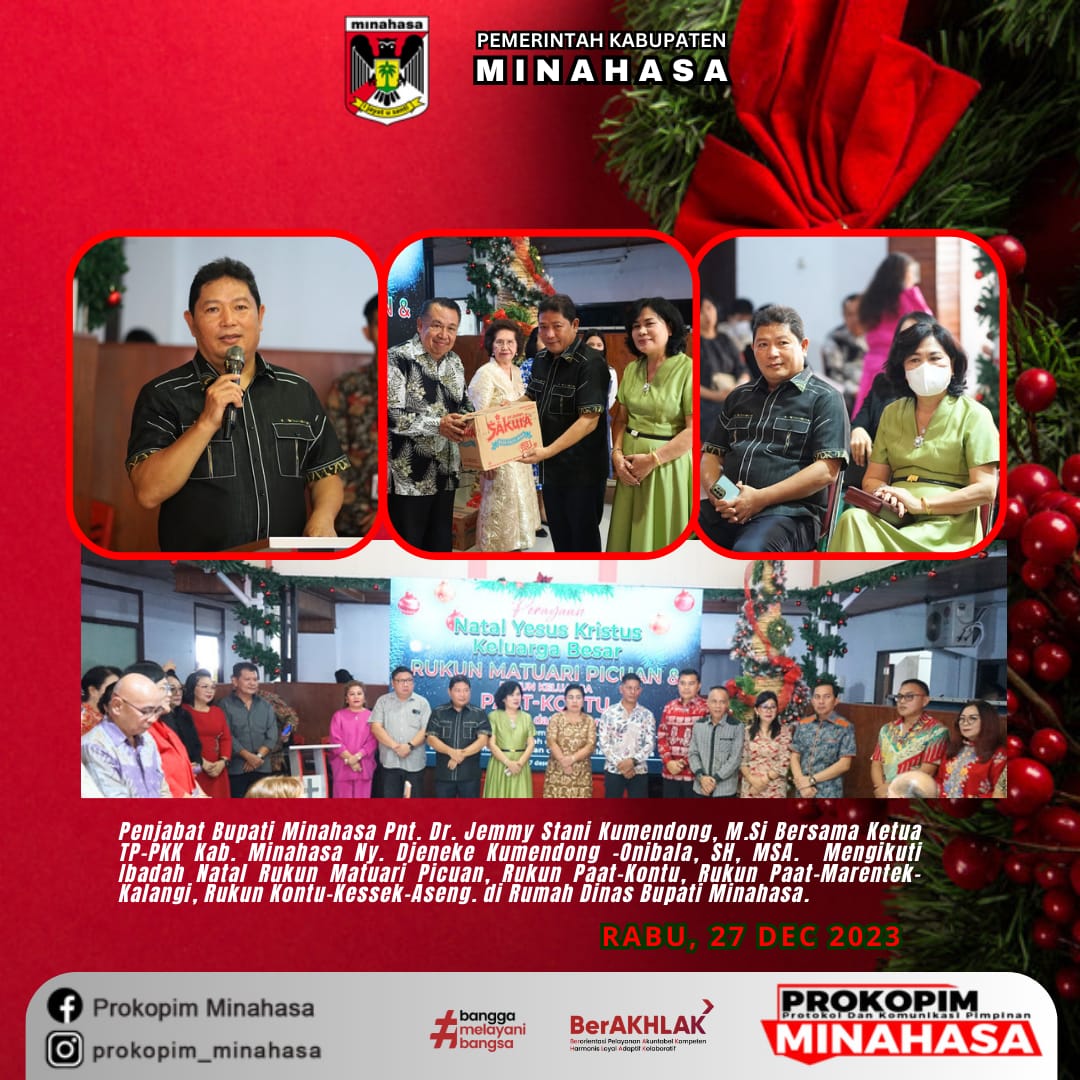 MINAHASA, SULUTPOSTonline.id – Penjabat Bupati Minahasa Pnt. Dr. Jemmy Stani Kumendong, M.Si Bersama Istri, Ketua TP-PKK Kabupaten Minahasa Ny. Djeneke Kumendong – Onibala, SH, MSA. Mengikuti Ibadah Natal Rukun Matuari Picuan, dirangkaikan dengan Rukun Paat-Kontu, Rukun Paat-Merentek-Kalangi, dan Rukun Kontu-Kessek-Aseng. Bertempat di Rumah Dinas Bupati Minahasa. Tondano, Rabu (27/12/23).