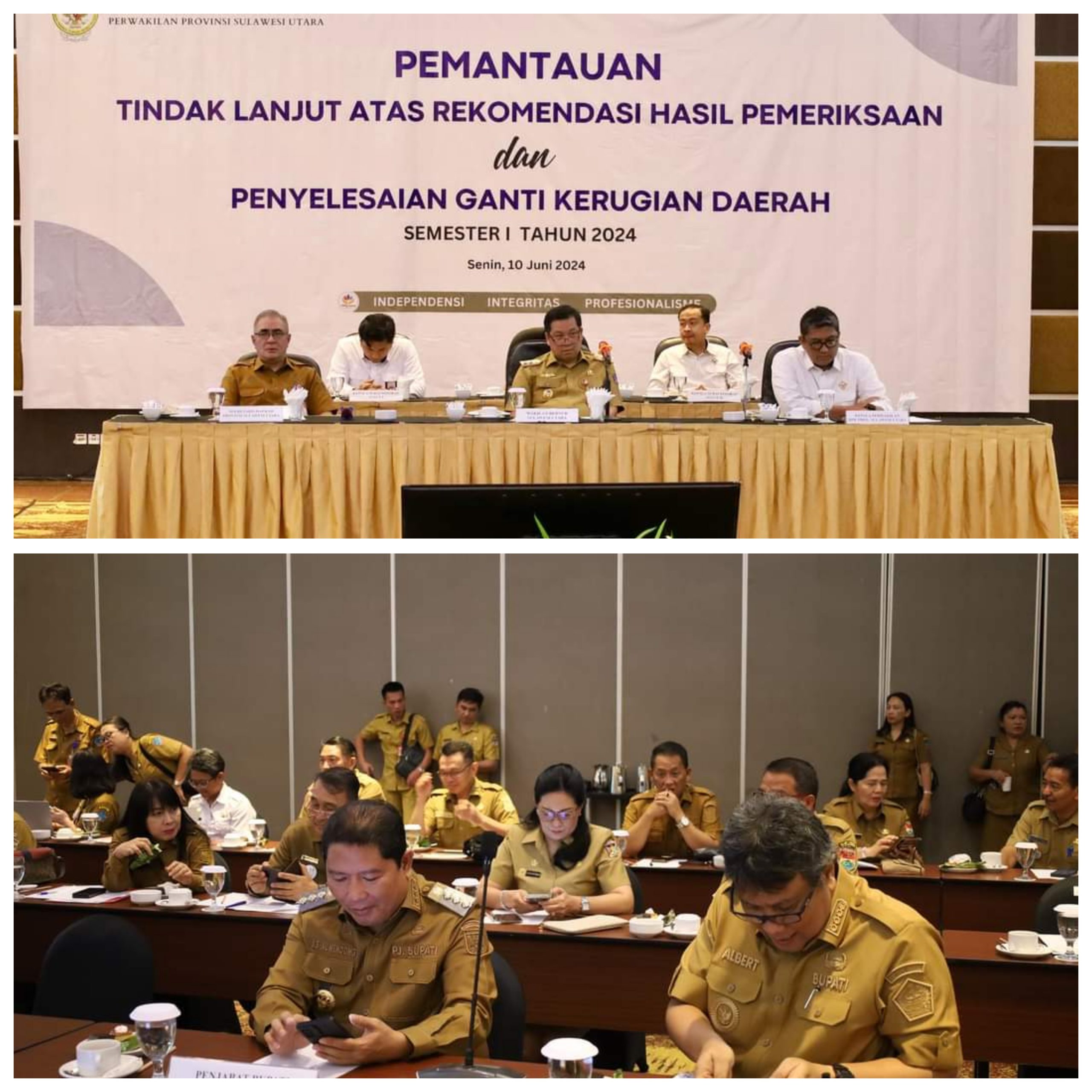 MINAHASA, SULUTPOST – Penjabat Bupati Minahasa Dr Jemmy Stani Kumendong MSi, bersama Sekretaris Daerah Dr Lynda Watania MM MSi, mengikuti kegiatan Pemantauan Tindak Lanjut atas Rekomendasi Hasil Pemeriksaan dan pemantauan (TLRHP) atas penyelesaian ganti kerugian daerah semester I Tahun 2024.