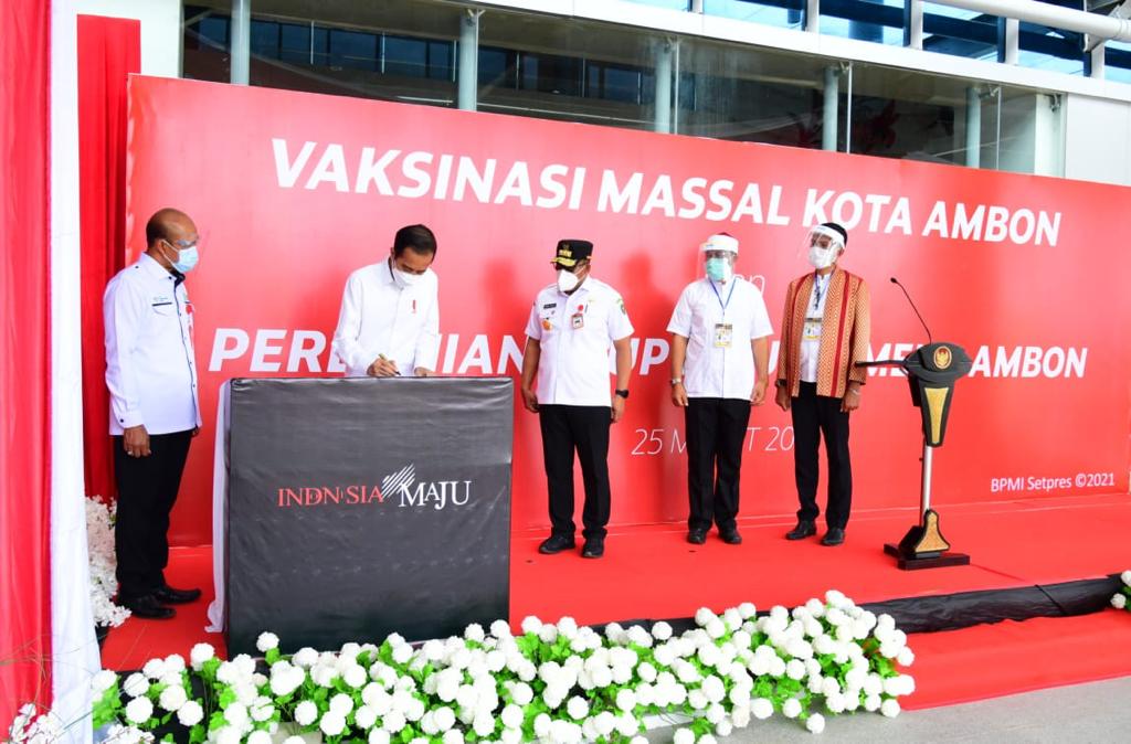 Usai memberikan pernyataan, Presiden Jokowi melakukan penandatanganan prasasti sebagai tanda peresmian RSUP dr. J. Leimena di Kota Ambon.