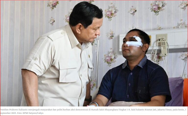 JAKARTA SULUT POSTonline.id – Presiden Prabowo Subianto menjenguk masyarakat dan polisi korban aksi demonstrasi yang tengah menjalani perawatan di Rumah Sakit Bhayangkara Tingkat 1 R. Said Sukanto Kramat Jati, Jakarta Timur, pada Senin, 1 September 2025. Korban yang masih dalam perawatan berjumlah 17 orang, terdiri dari 14 anggota kepolisian dan 3 masyarakat sipil, sementara puluhan lainnya telah diperbolehkan pulang.
