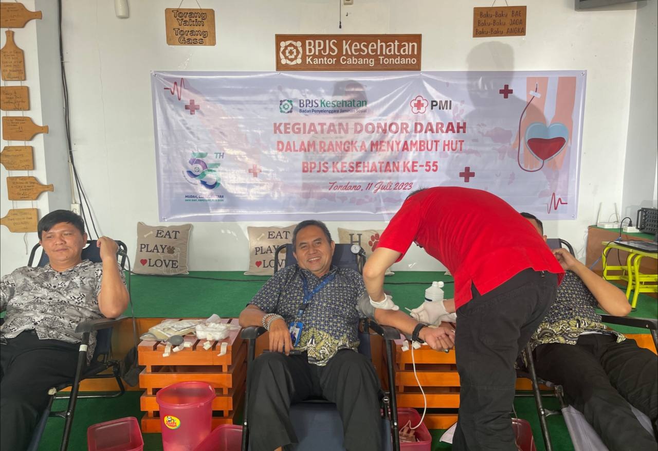 MINAHASA, SULUTPOST – Dalam rangka menyambut perayaan Hari Ulang Tahun (HUT) ke-55, Badan Penyelenggara Jaminan Sosial (BPJS) Kesehatan mengadakan kegiatan donor darah bertempat di Ballroom Kantor Pusat, Selasa (11/07/2023).