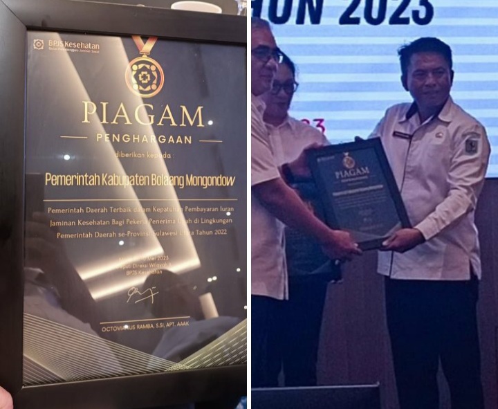 BOLMONG,SULUTPOST- Pemerintah Kabupaten Bolaang Mongondow (Pemkab-Bolmong) menerima penghargaan peringkat 3 (tiga) terbaik dalam kepatuhan pembayaran iuran jaminan kesehatan bagi pekerja penerima upah pekerja, dilingkungan pemerintah daerah tahun 2022 dan triwulan I tahun 2023.