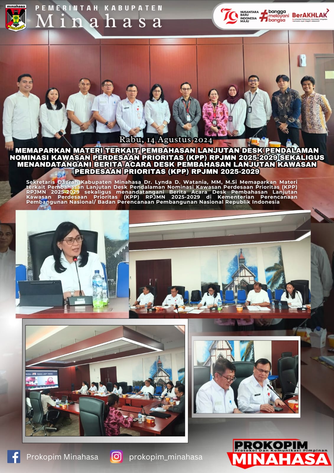 MINAHASA, SULUTPOST – Sekretaris Daerah (Sekda) Kabupaten Minahasa Dr.Lynda D. Watania MM MS, memaparkan materi terkait pembahasan lanjutan desk pendalaman Nominasi Kawasan Perdesaan Prioritas (KPP) RPJMN 2025-2029.