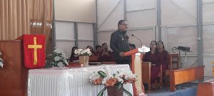 Foto: Bupati Bolmong Ir.Limi Mokodompit MM, saat menyampaikan sambutan di hadapan jemaat gereja Zaitun Dumoga, (Bolmong-red) Sabtu 28 Oktober 2023 siang tadi.