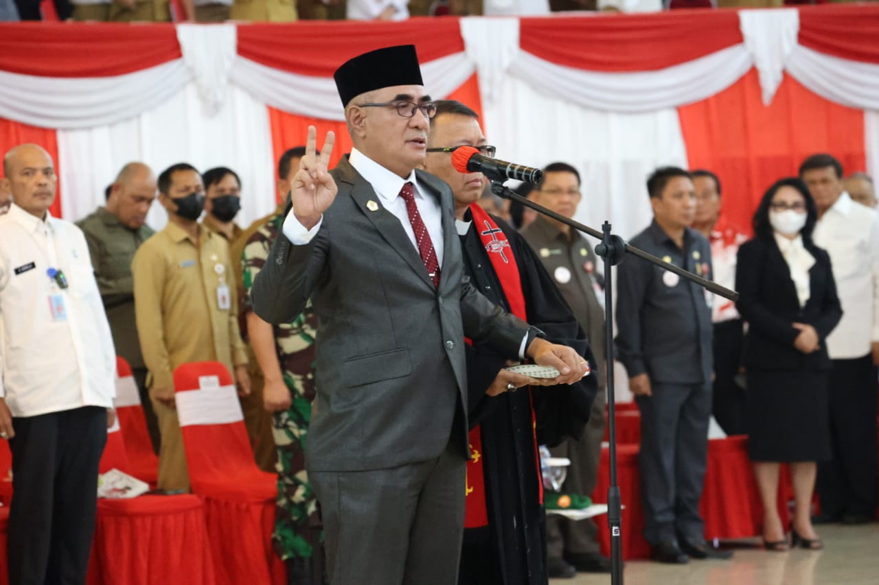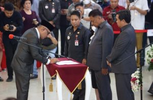 MANADO, SULUT POST – Gubernur Sulawesi Utara (Sulut) Olly Dondokambey didampingi Wakil Gubernur Steven O.E Kandouw Melantik Sekretaris Daerah Provinsi (Sekdaprov) Sulut Steve Kepel di Aula Mapalus, Senin (5-12-2022).