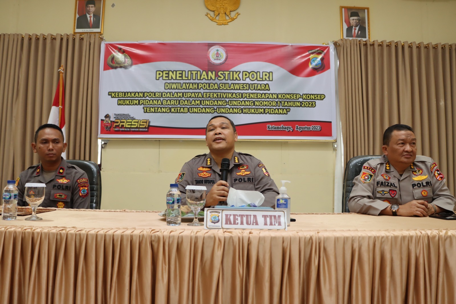 Setelah disambut oleh Kapolres Kotamobagu yang diwakili oleh Wakapolres Kompol Arie Prakoso, SIK, dalam pembukaannya, ketua Tim peneliti menjelaskan tujuan utama penelitian ini adalah mendapatkan masukan terkait Undang-Undang nomor 1 tahun 2023 tentang Hukum Pidana yang baru sehingga nantinya dapat dijadikan bahan koreksi yang lebih baik.