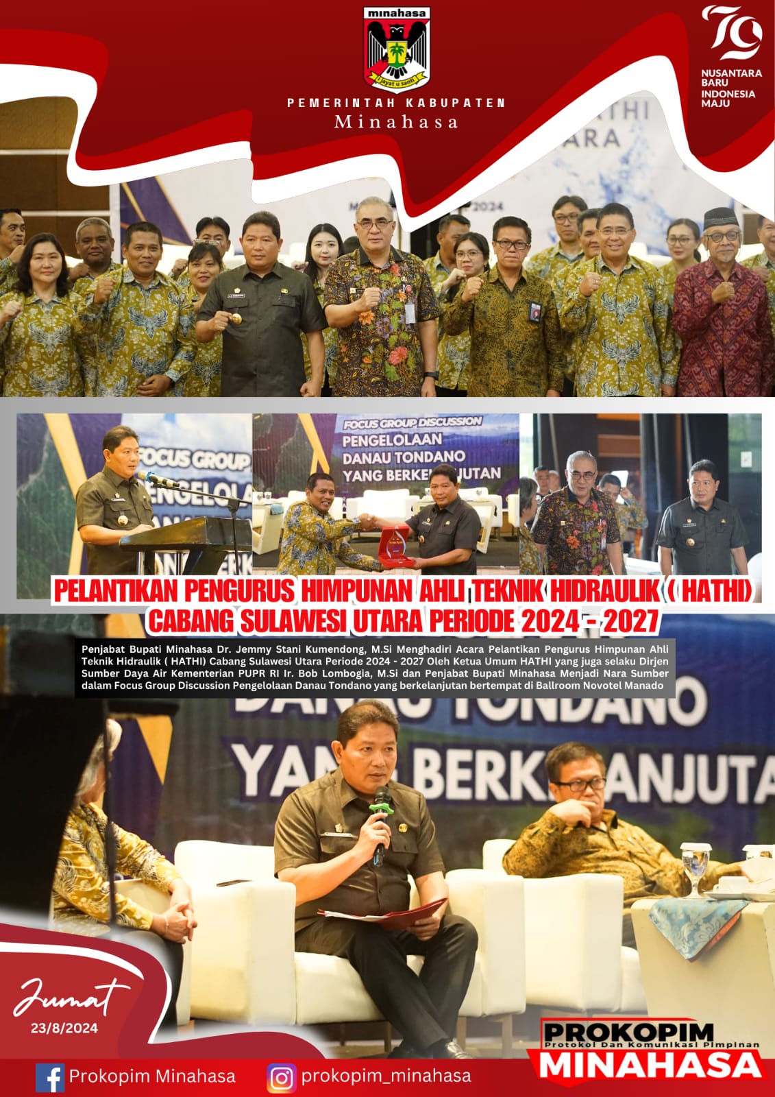 MINAHASA, Penjabat Bupati Minahasa, Dr. Jemmy Stani Kumendong, M.Si., menghadiri acara pelantikan pengurus Himpunan Ahli Teknik Hidraulik Indonesia (HATHI) Cabang Sulawesi Utara periode 2024-2027 yang digelar di Ballroom Novotel Manado. Jumat (23/08/2024). Acara ini dipimpin langsung oleh Ketua Umum HATHI, yang juga menjabat sebagai Dirjen Sumber Daya Air Kementerian PUPR RI, Ir. Bob Lombogia, M.Si. […]