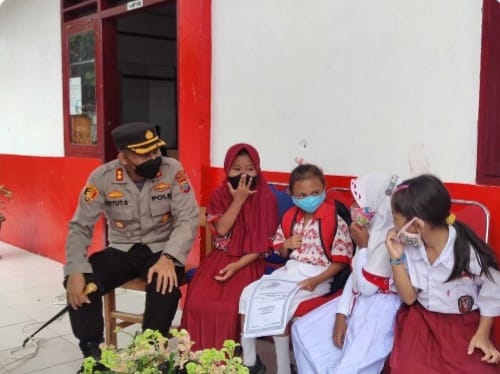 Kapolres dan Kabag SDM membagikan masker pada saat memantau kegiatan vaksinasi untuk anak usia 6 – 11 tahun di Sekolah dasar Negeri 2 Salongo.