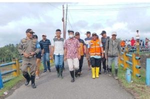 Selanjut Bupati bersama rombongan kemudian bertolak ke Kecamatan Dumoga Barat untuk memantau kondisi jembatan penghubung antara Desa Doloduo dan Mekaruo yang putus akibat tingginya luapan air Bendung Kosinggolan.