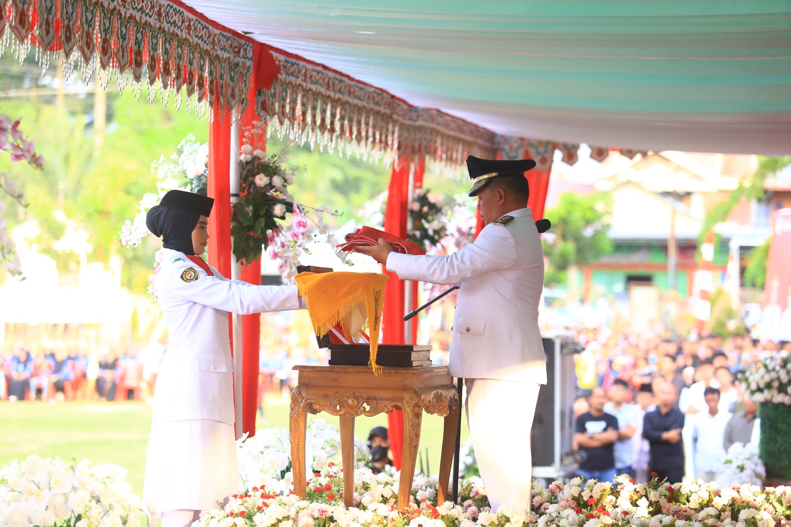KOTAMOBAGU,SULUTPOST—Wakil Wali Kota Kotamobagu, Nayodo Koerniawan, S.H., bertindak sebagai Inspektur Upacara (Irup) pada Upacara penurunan Bendera Merah Putih dalam rangka memperingati Hari Ulang Tahun (HUT) ke – 78 Kemerdekaan Republik Indonesia, Kamis (17/8).