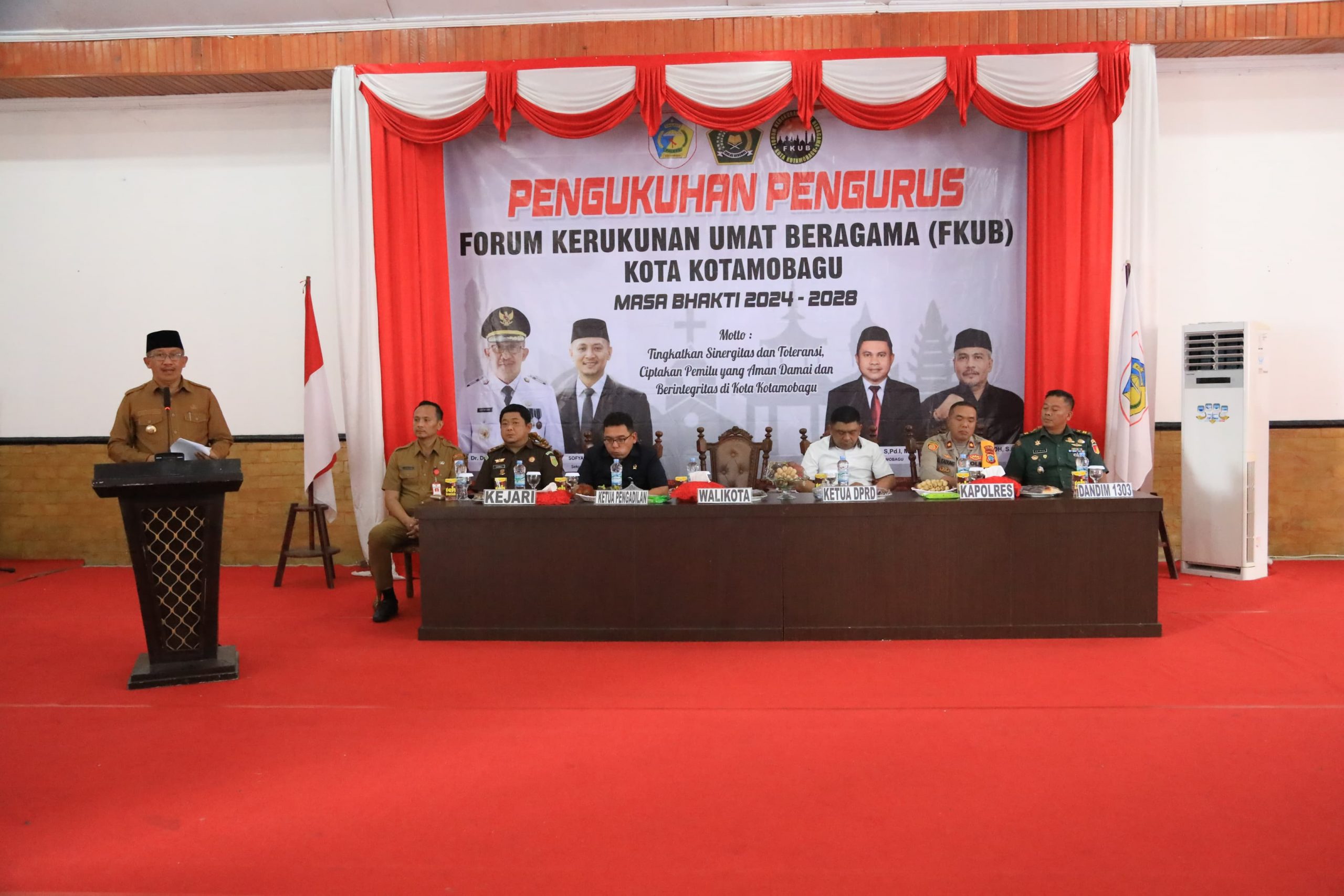 Wali Kota Kotamobagu dalam sambutannya menyampaikan atas nama Pribadi, Pemerintah Daerah dan Masyarakat Kota Kotamobagu mengucapkan selamat atas pengukuhan pengurus Forum Kerukunan Umat Beragama Kota Kotamobagu Masa Bakti 2024 – 2028.