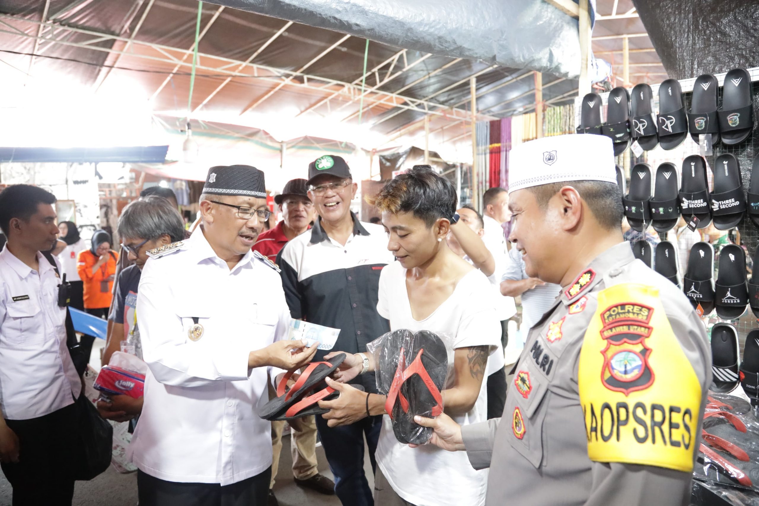 KOTAMOBAGU,SULUTPOST-Penjabat Wali Kota, Dr. Drs. Hi. Asripan Nani., M.Si bersama Ketua TP PKK Kota Kotamobagu dan Forkopimda Berbelanja di Pasar Senggol Gogagoman.