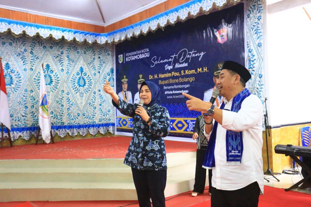 KOTAMOBAGU,SULUTPOST—Wali Kota Kotamobagu, Ir. Hj. Tatong Bara menerima kunjungan kerja Bupati Kabupaten Bone Bolango – Provinsi Gorontalo, H. Hamim Pou, S.Kom, M.H., dan jajaran Pemerintah Daerah Kabupaten Bone Bolango di Kota Kotamobagu, Jumat (16/6).