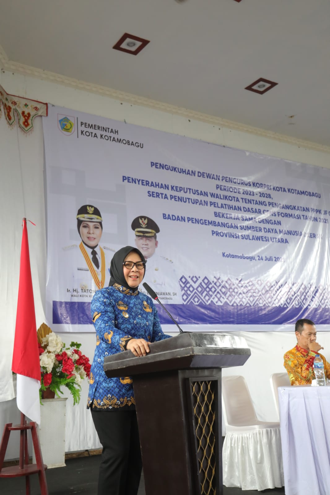 KOTAMOBAGU,SULUTPOST—Wali Kota Kotamobagu, Ir. Hj. Tatong Bara menyerahkan Surat Keputusan (SK) Pegawai Pemerintah dengan Perjanjian Kerja (P3K) pada jabatan fungsional Guru dan menutup secara resmi pelaksanaan Pelatihan Dasar (Latsar) Calon Pegawai Negeri Sipil (CPNS) formasi Tahun 2021 dilingkungan Pemerintah Daerah Kota Kotamobagu, Senin (24/7).