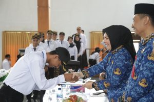 Wali Kota Kotamobagu Ir.Hj.Tatong Bara, saat menyerahkan Surat Keputusan (SK) kepada Pegawai Pemerintah Dengan Perjanjian Kontrak (P3K) pada jabatan fungsional guru. Senin (24/7/23)