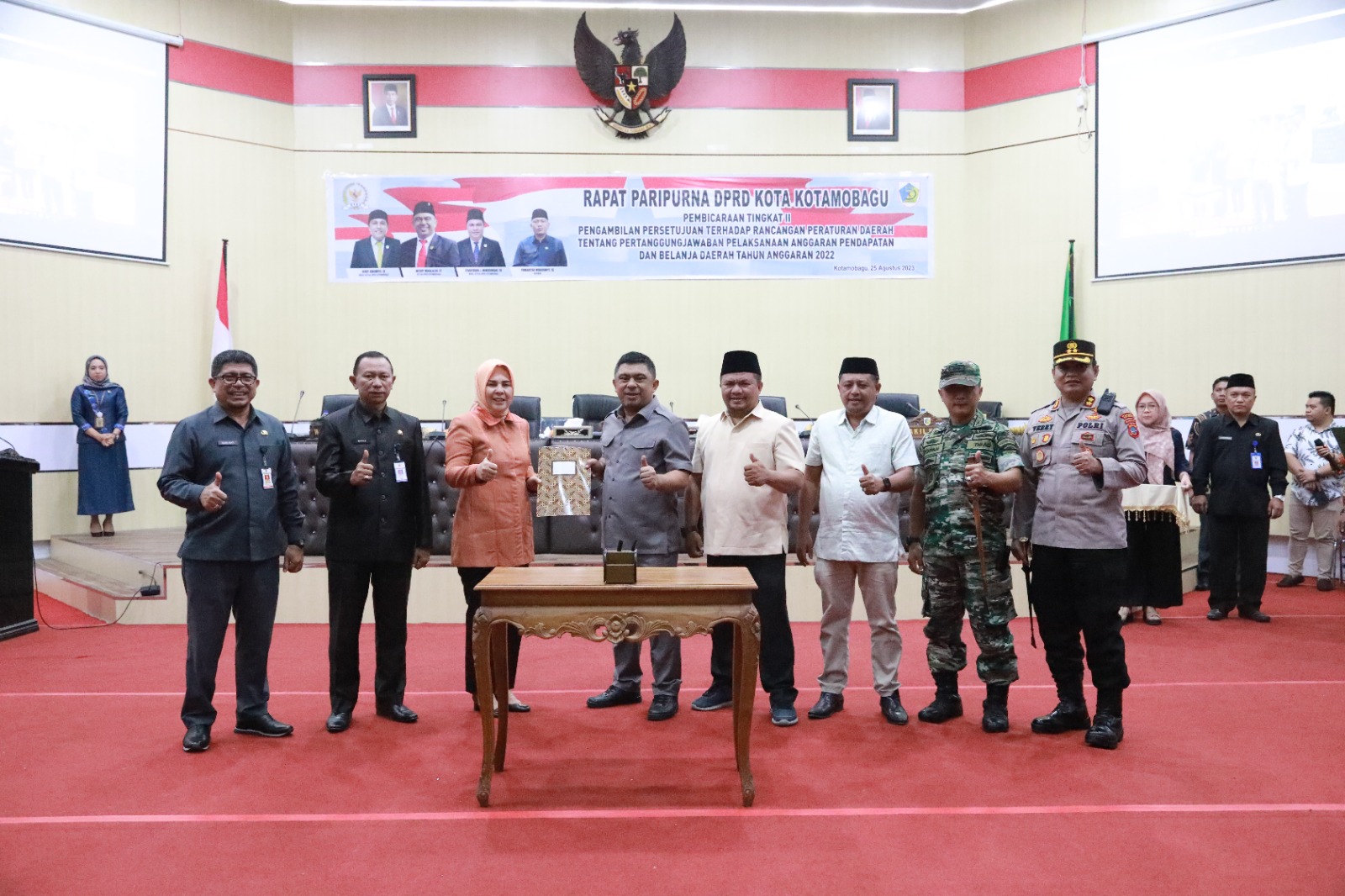 KOTAMOBAGU,SULUTPOST—Wali Kota Kotamobagu, Ir. Hj. Tatong Bara menghadiri Rapat Paripurna DPRD Kota Kotamobagu dalam rangka Pembicaraan Tingkat II Pengambilan Persetujuan Terhadap Rancangan Peraturan Daerah (Ranperda) Tentang Pertanggungjawaban Pelaksanaan APBD Tahun Anggaran 2022, Jumat (25/8).