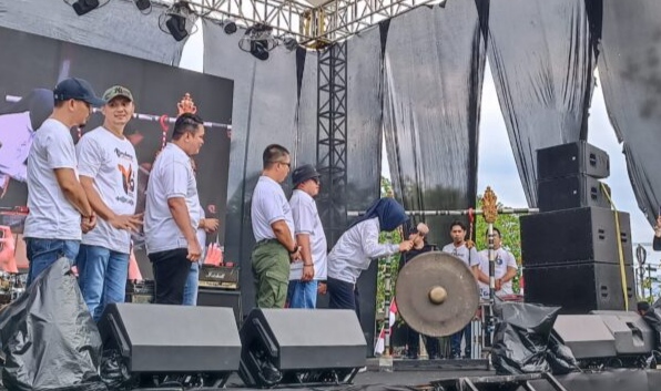 Pembukaan Expo Kotamobagu 2023 ditandai pemukulan gong oleh Wali Kota Ir Tatong Bara didampingi Wakil Wali Kota Nayodo Koerniawan.