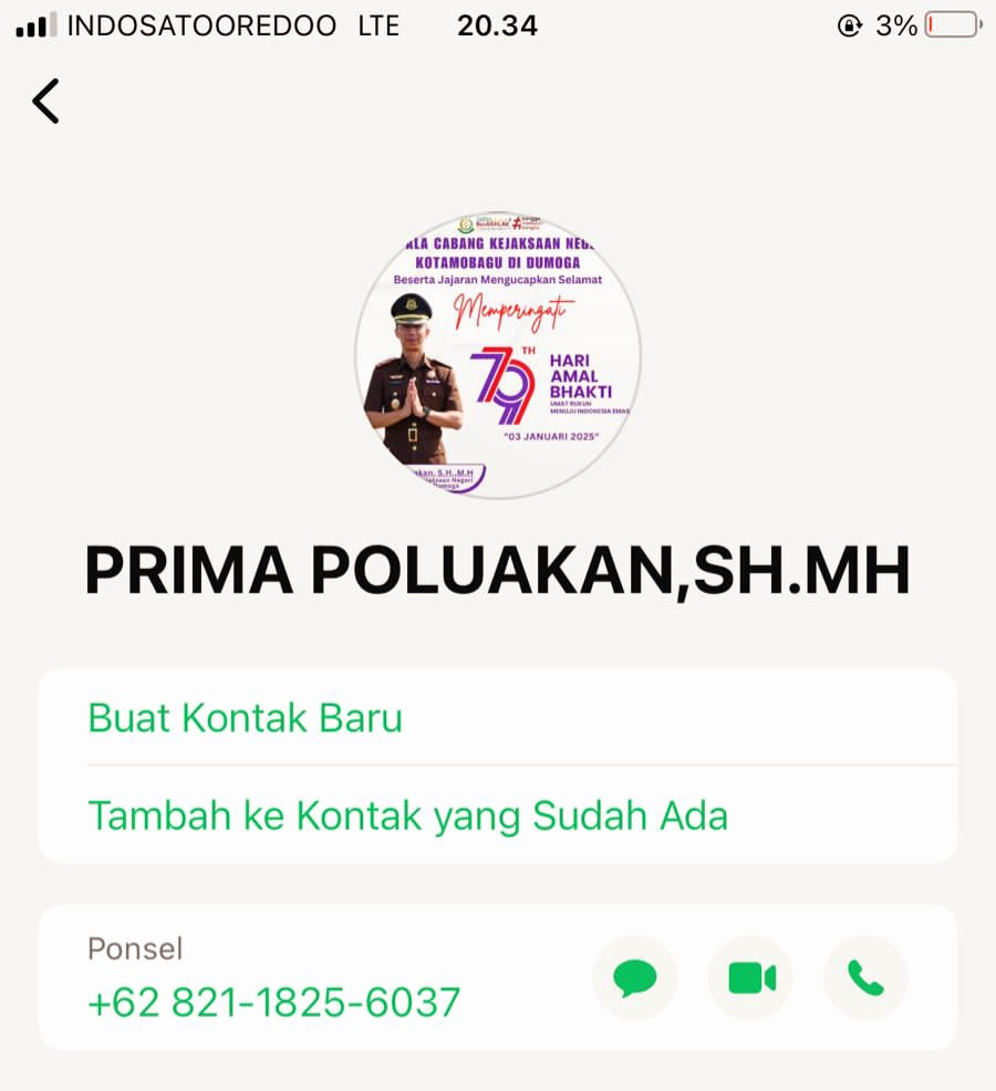 Pasalnya, beredar akun WhatsApp bodong dengan Nomor 082118256037. yang mencatut foto dan nama Kepala Cabang Kejaksaan Negeri (Kacabjari) Dumoga Prima Poluakan SH.